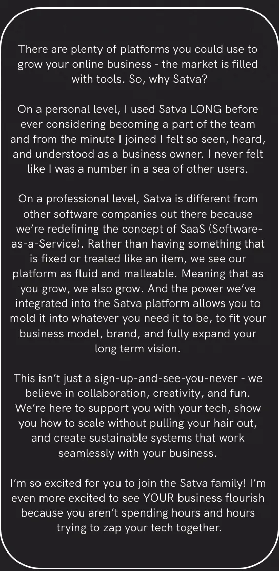 Beyond our usual Satva support, we also offer 7-Figure Foundations, our flagship, self-paced, step-by-step academy where you can learn how to design & create systems that support you both in your business and outside it, so you can build the business of your dreams without sacrificing yourself in the process. 7-Figure Foundations walks you through exactly how to set up your business AND your life for maximum productivity, peak performance, automated growth, and impactful success as an online entrepreneur. The program is "on tap" anytime you want to dive in — just click here to sign up and get instant access! 🔑